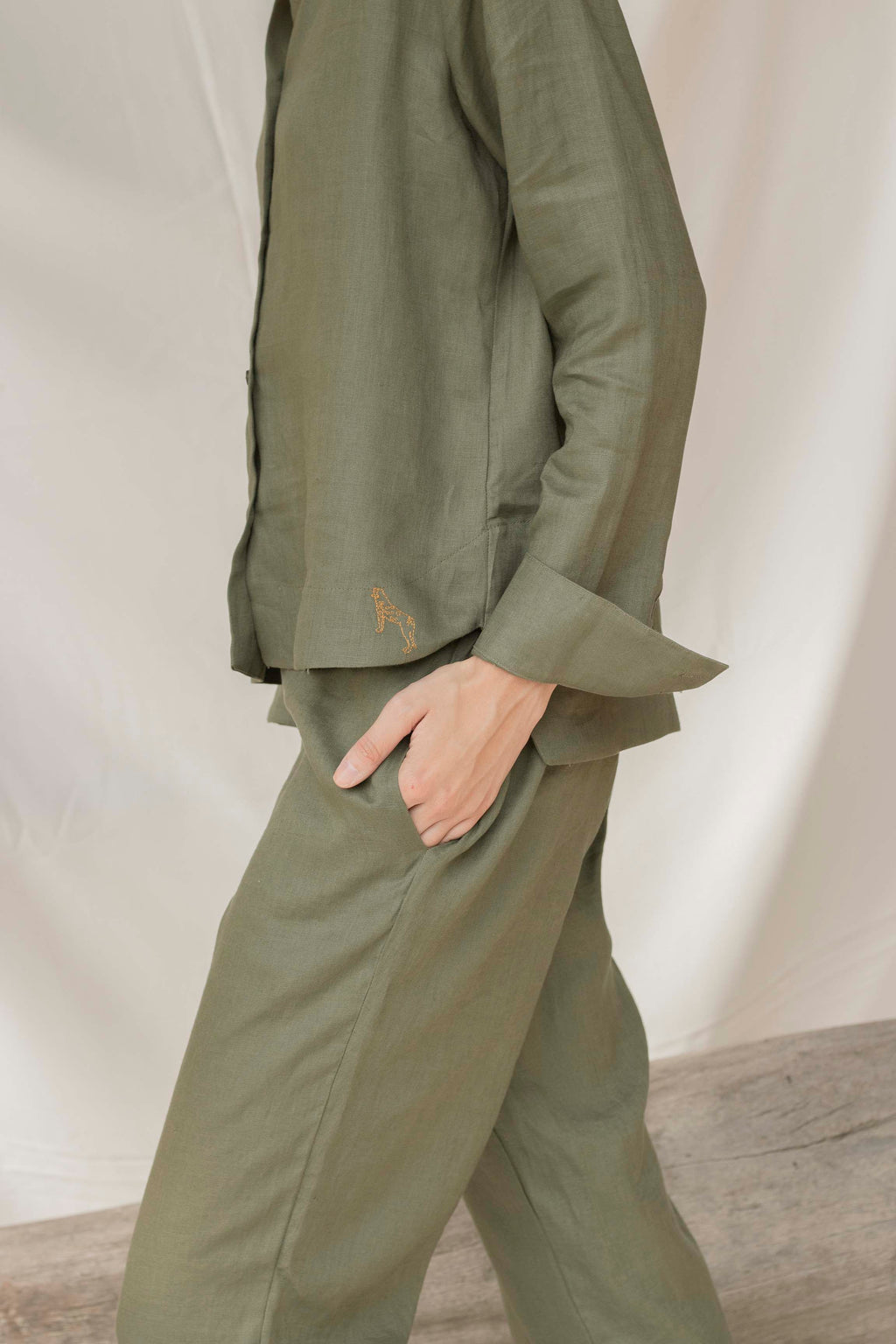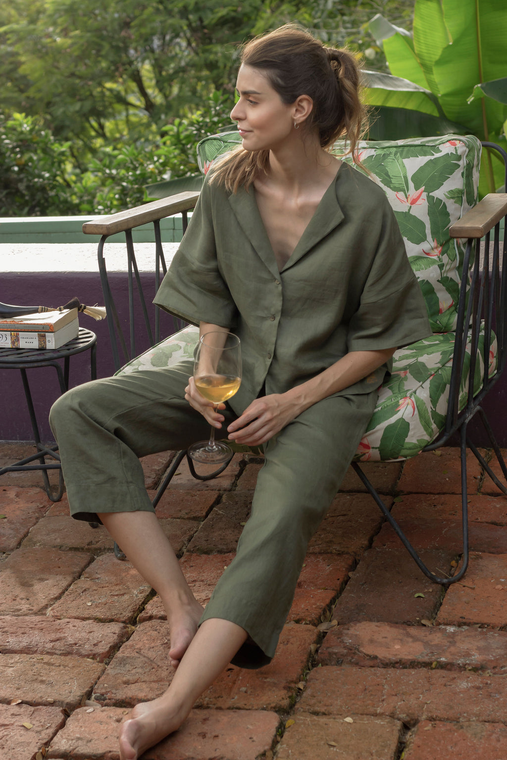 Pantalón fluido de lino 100%. Bolsillos laterales. Resorte en cintura. Largo hasta los tobillos.