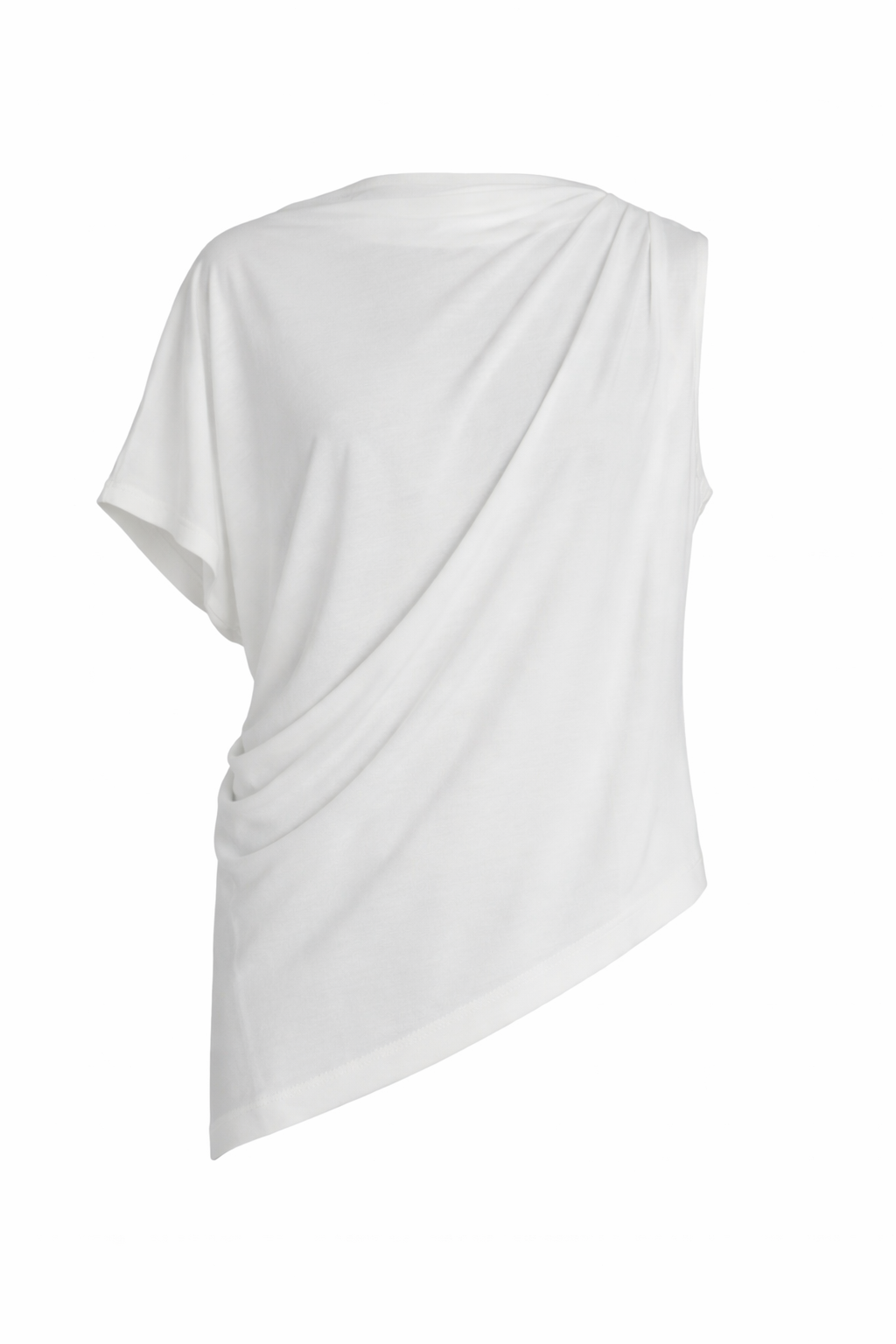 Top asimétrico en color crudo. Manga sisa en un hombro y corta en el otro. Largo asimétrico. Cuello alto. Hecho en Colombia.