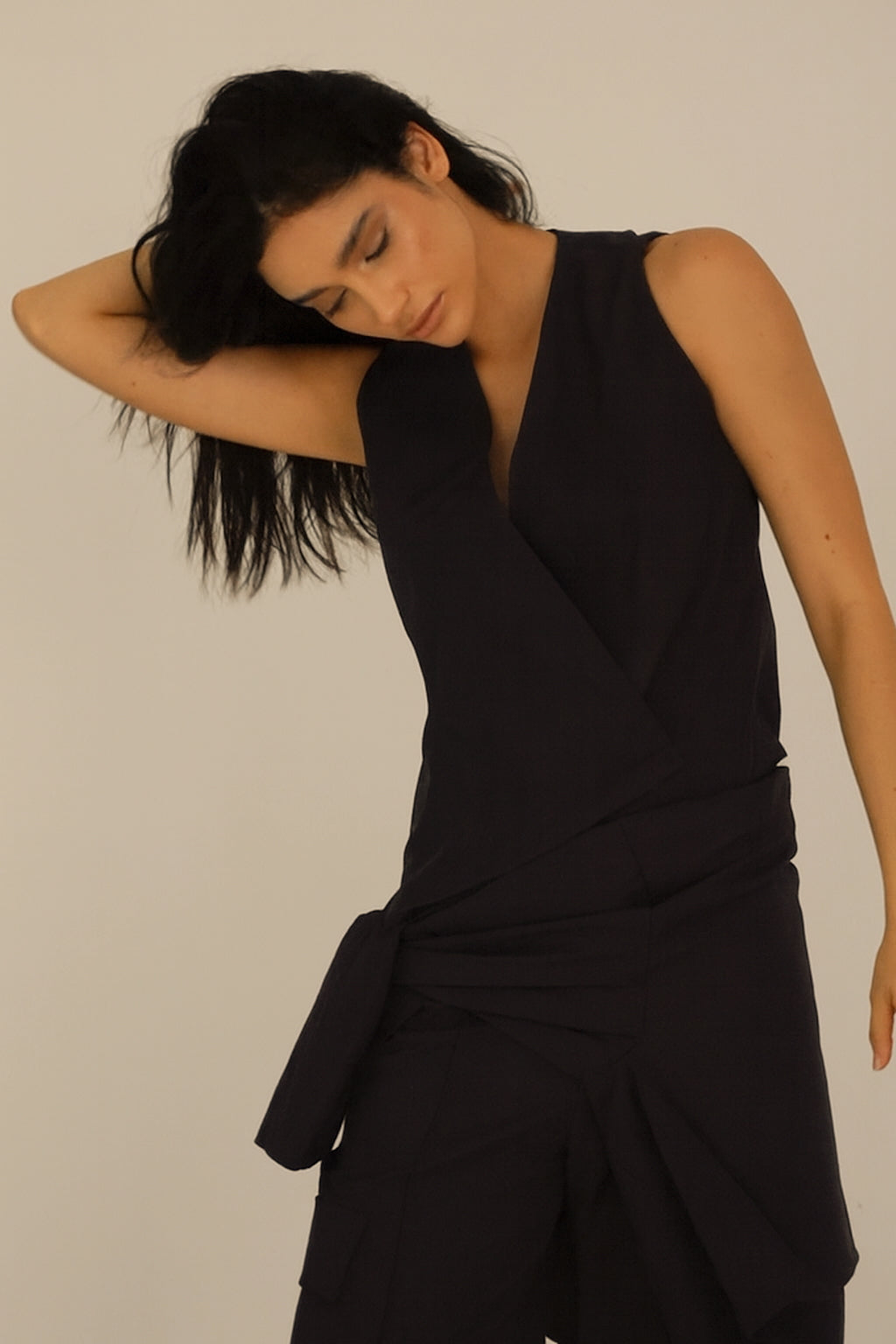 Chaleco color negro, de escote pico con manga sisa. Corte asimétrico delantero. Cierre frontal cruzado con botón interno. Hecho en Colombia.